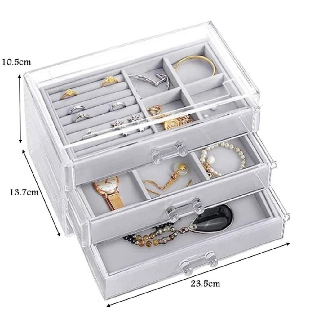 - الاسم: منظم أكسسوارات ثلاثة أدراج أكريليك شفاف